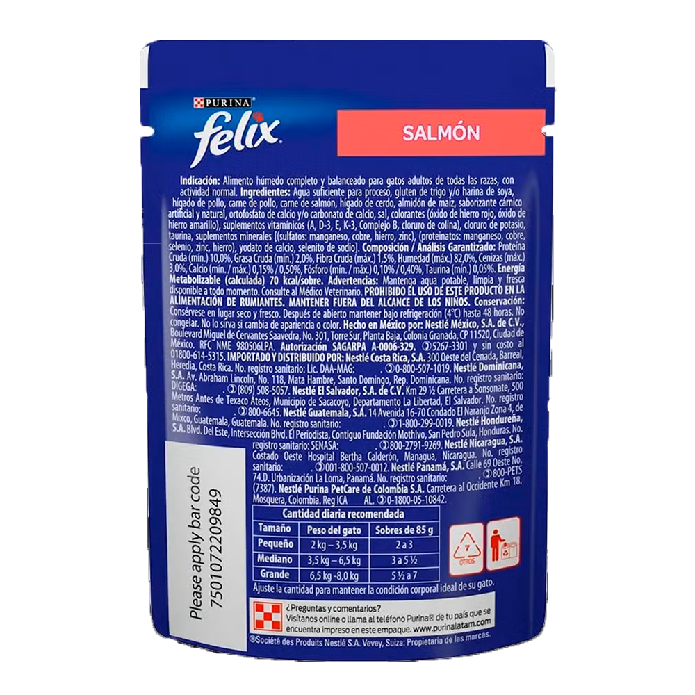 Purina® Felix® Salmón en Salsa Alimento húmedo para Gatos, para gatos adultos en mantenimiento.