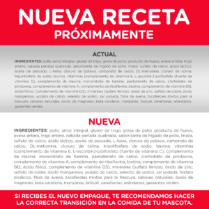 • Ingredientes naturales, de alta calidad y fáciles de digerir, además de vitaminas, minerales y aminoácido (taurina).